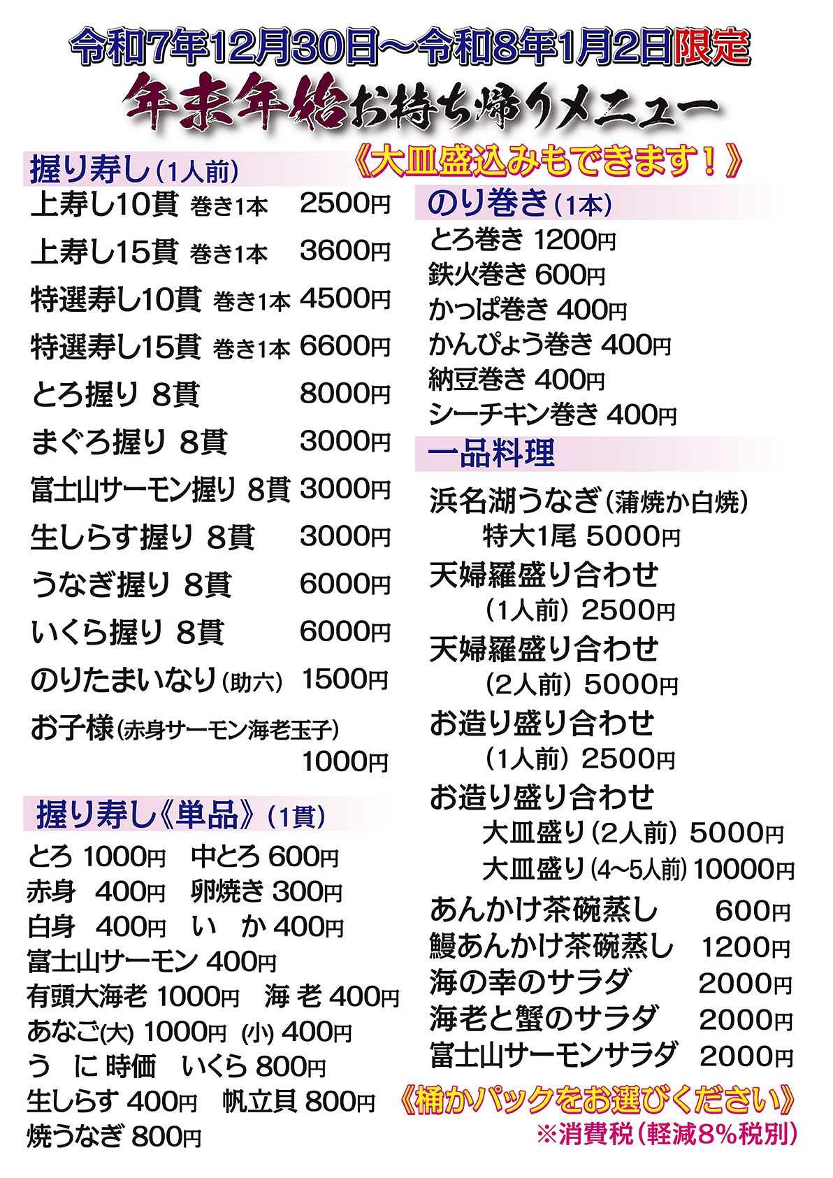 年末年始限定「お持ち帰りメニュー」もございます。
