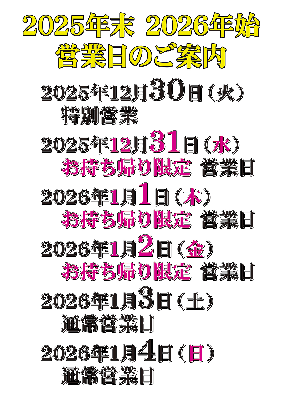 2025年12月31日(水)  お持ち帰り限定 営業日